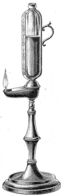 Podobnie i świeca służyła jako miernik czasu, jej spalanie można było odczytać na podziałce. Niektóre zegary świecowe wybijały godziny. Urządzenie dźwiękowe było bardzo proste, w jednakowych odstępach wtapiano gwoździe z dużymi łepkami. Przy spalaniu się świecy gwoździe wypadały na podstawę lichtarza, oznajmiając upływ godziny. Jak podaje biograf angielskiego króla Alfreda Wielkiego w pałacu królewskim były specjalne latarnie z drewna z okienkami z cienkiej skóry, w których przez około 4 godziny paliły się świece woskowe. Gdy jedna latarnia gasła, zapalano następną. Król układał swój harmonogram dnia według tego zegara. Również Ludwik IX Święty używał świec do planowania czynności nocnych i dziennych. Na podobnej zasadzie jak zegary ogniowe, działały zegary oliwne. Mierzono nimi czas poprzez odczytywanie wskazań poziomu spalanej oliwy.